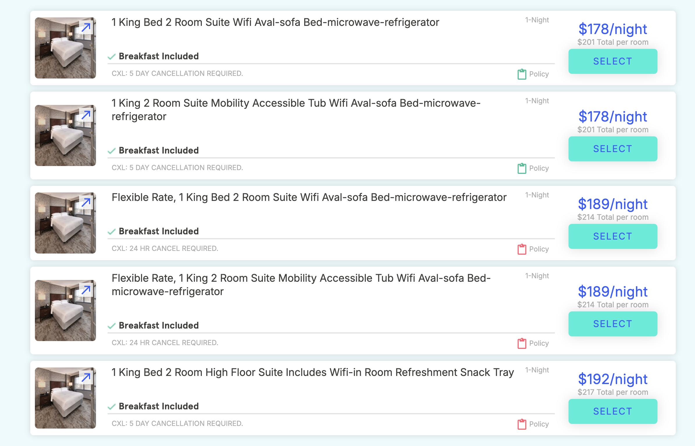 Rooms that include breakfast will display a green checkmark along with the label “Breakfast Included” directly under the room description.