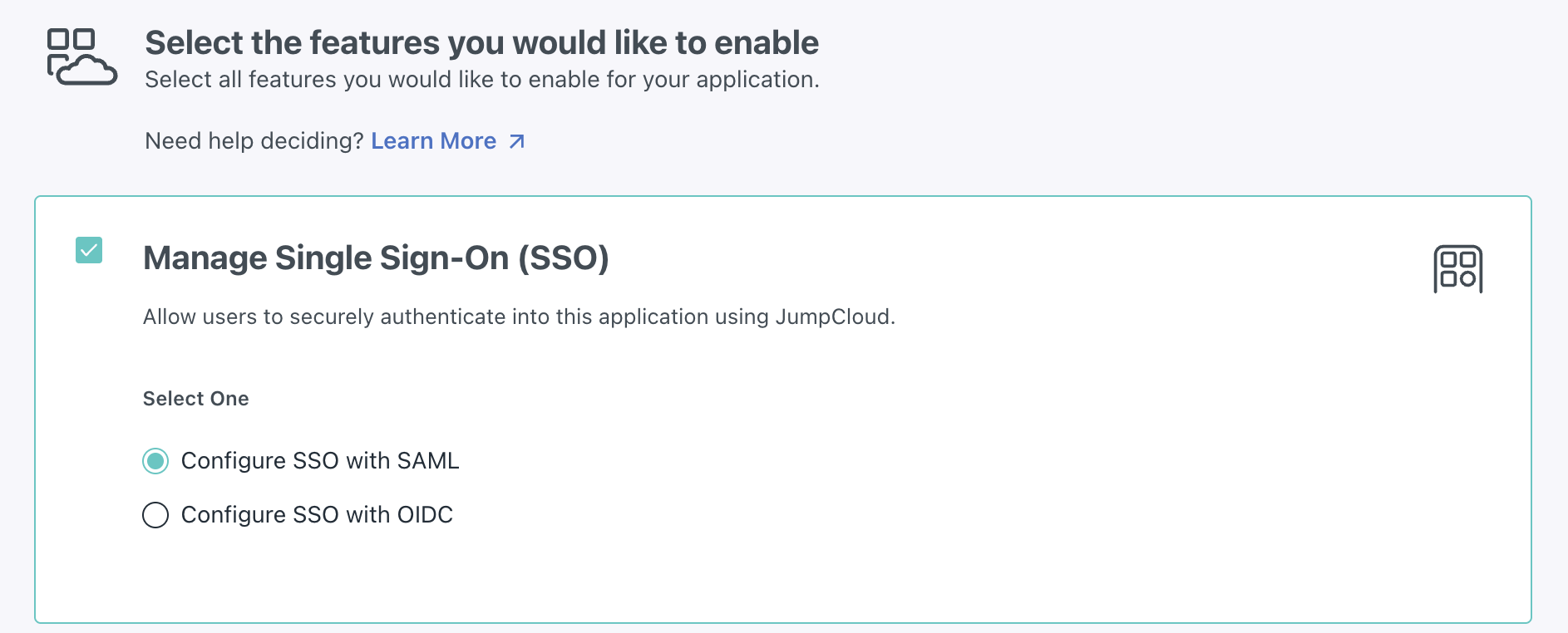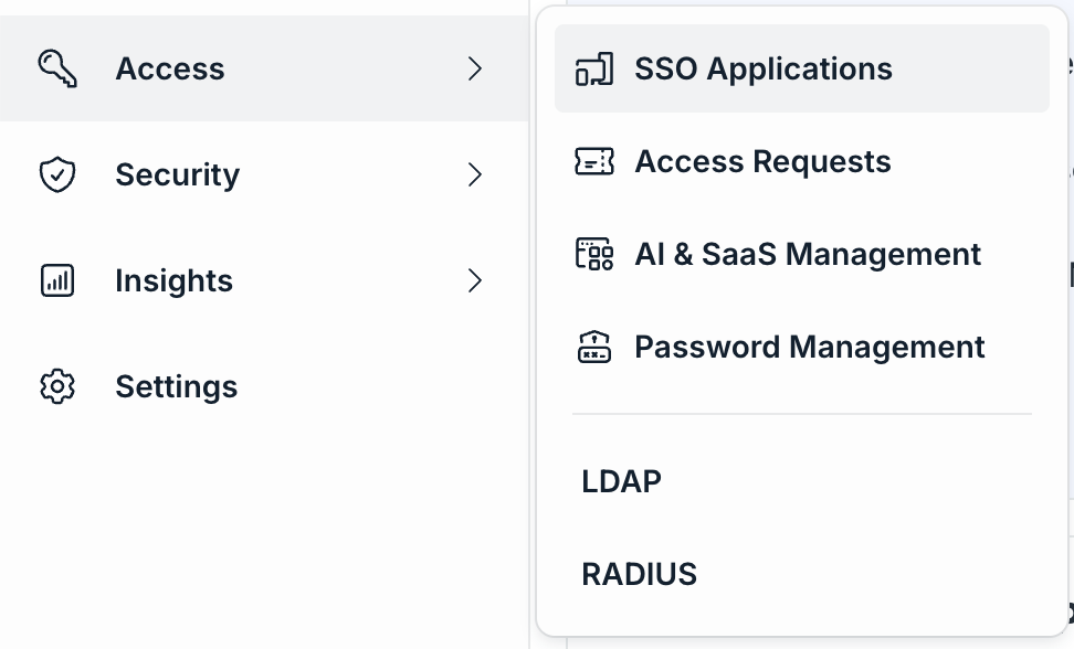 1. Log into your JumpCloud admin account, go to "Access" > “SSO Applications” and click on "Add New Application"